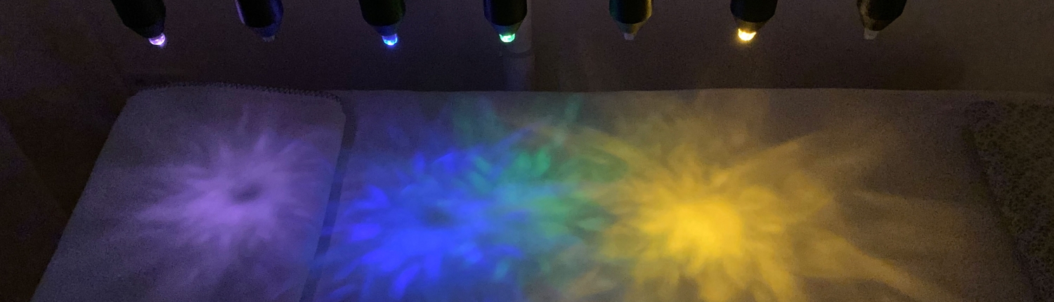 Auf dem Rücken liegend, sind diese Bergkristalle auf die Hauptenergiezentren des Körpers (Chakren) ausgerichtet und leuchten abwechselnd in den entsprechenden Farben.